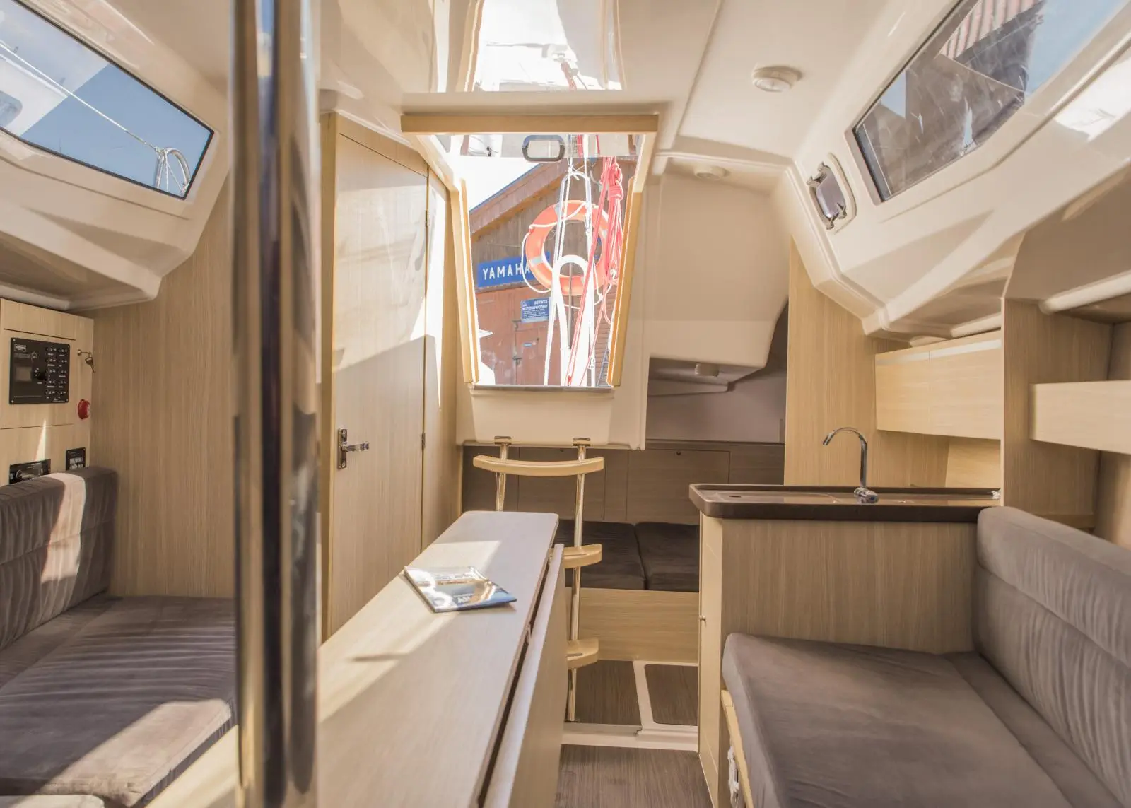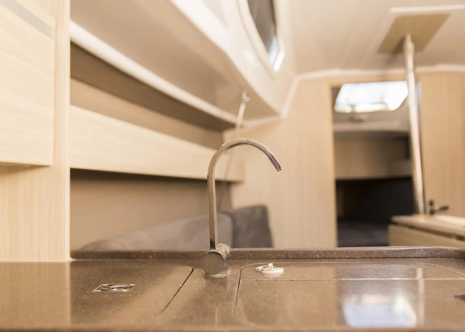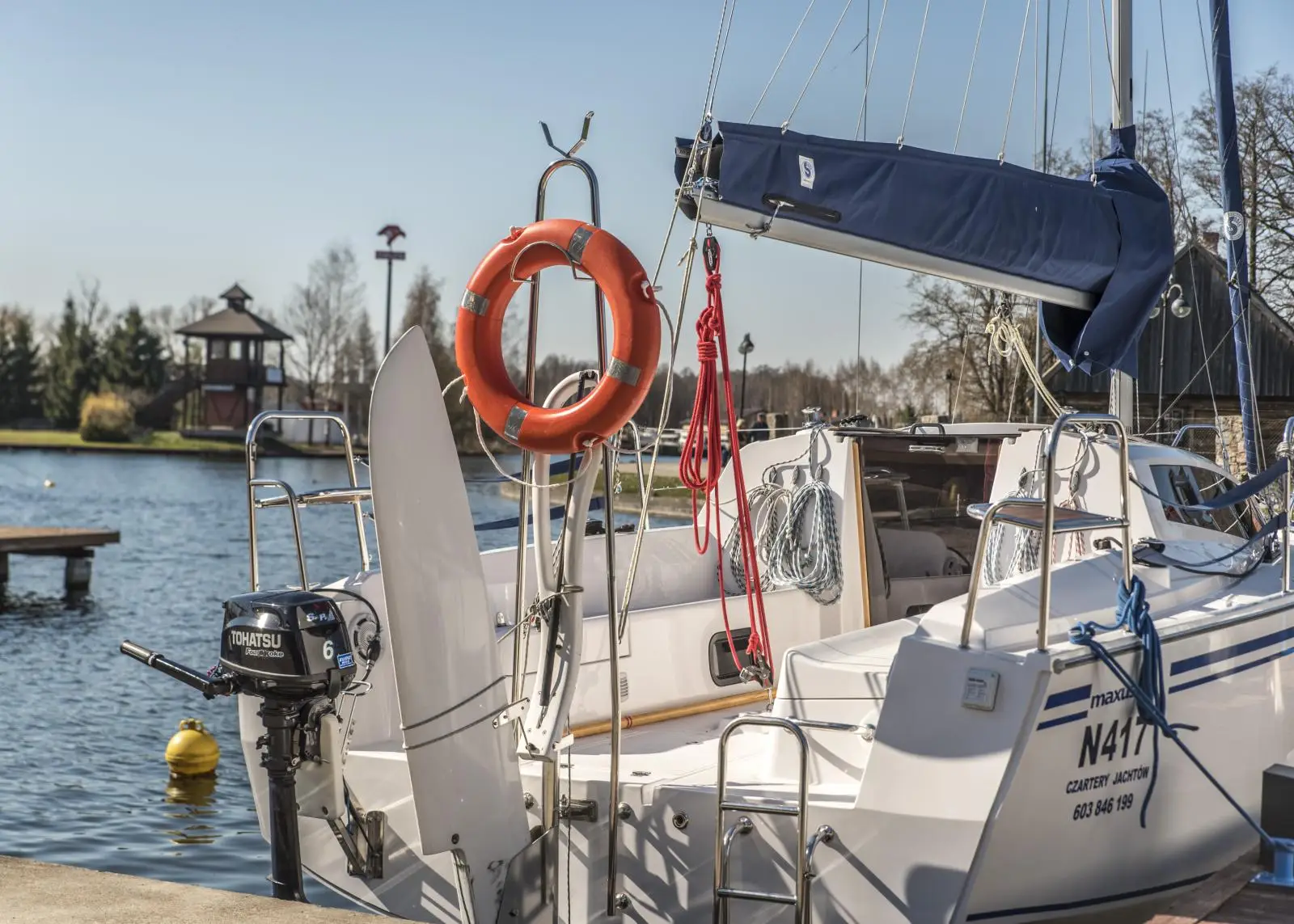 • Kompletne wyposażenie kambuza: 2 garnki, patelnia, durszlak, chochelka, sztućce, nóż do chleba, kubki, talerze, deska do krojenia, miski